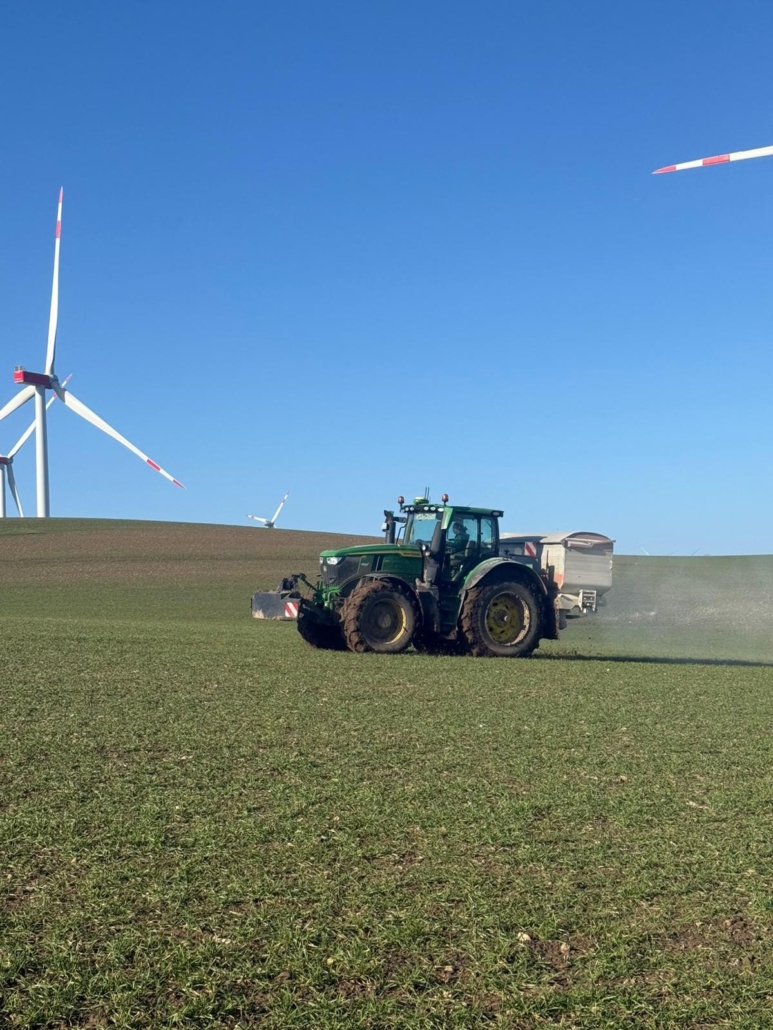 Damit die Pflanzen nicht „hungern“, haben wir Anfang der Woche mit der Düngung begonnen und versorgen unsere Kulturen mit Stickstoff, Kalium und Schwefel.